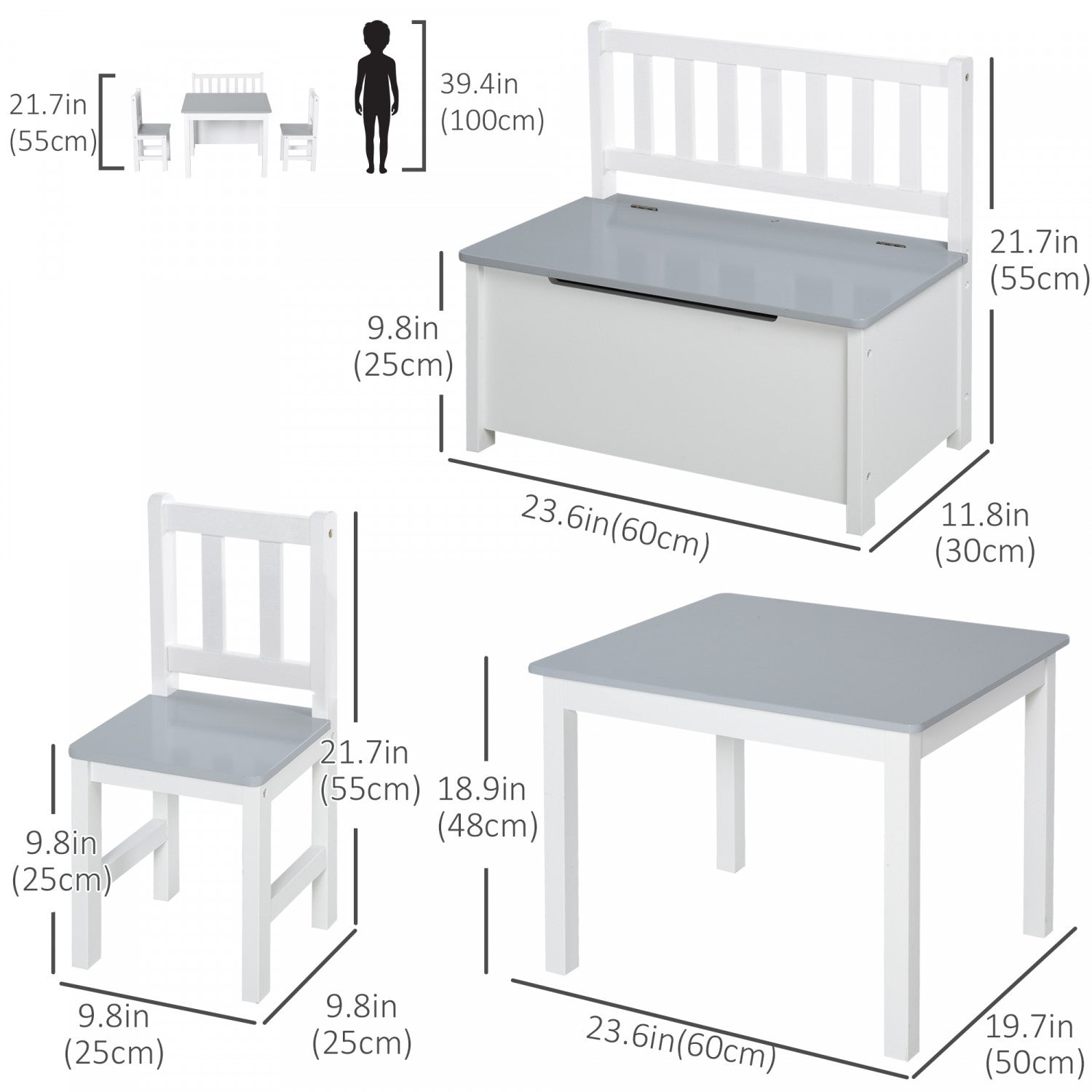 | Key Features | ● Ideal pour la chambre de vos enfants, la salle de jeux ou le salon ● Comprend un ensemble de 4 pieces pour enfants, une table, 2 chaises et un banc de rangement ● Fournit un espace de rangement pratique pour organiser des livres, des jouets, des collations ● Fabrique a partir d'une construction en bois robuste et solide ● Cadeau parfait pour les enfants de 3 ans et plus ● Facile a assembler et a nettoyer |