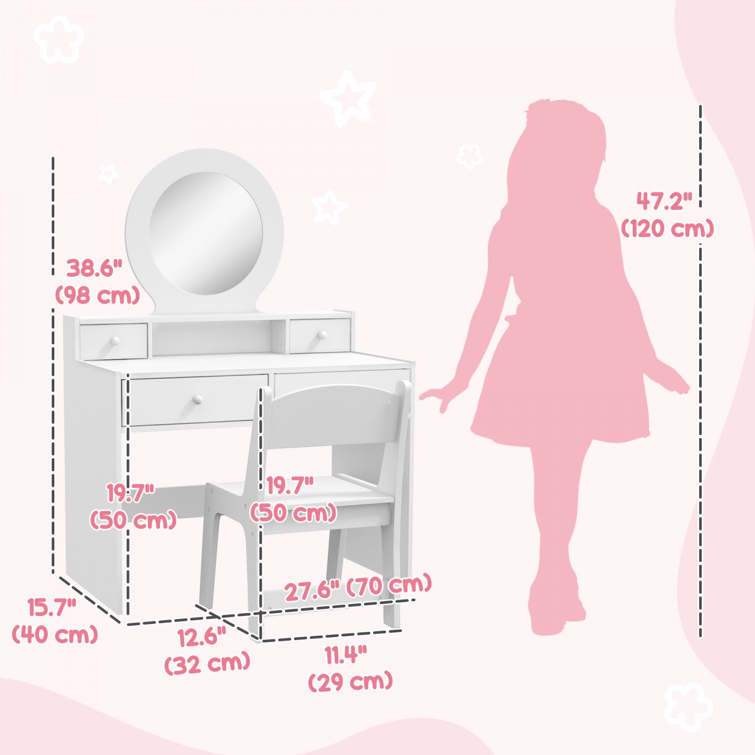 | Key Features | ● L'ensemble en deux pieces permet a deux enfants de s'amuser simultanement ● La construction en MDF aux bords arrondis ameliore la securite lors de l'utilisation ● Quatre tiroirs offrent suffisamment de rangement pour le maquillage et les accessoires ● Miroirs ovales transparents, adaptes a la toilette de vos tout-petits ● Assemblage necessaire, permettant une experience de configuration personnalisable. |