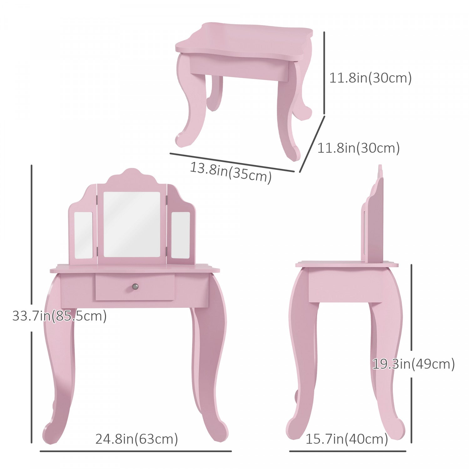 | Key Features | ● L'ensemble de 2 pieces comprend une table de maquillage et un tabouret assorti ● Convient aux chambres d'enfants, aux salles de jeux et aux garderies ● Cadre en bois MDF de haute qualite avec coins arrondis ● 3 miroirs transparents visibles en acrylique qui ne se cassent pas facilement ● Deux miroirs sur le cote peuvent etre tournes pour plus de commodite ● Assemblage requis |