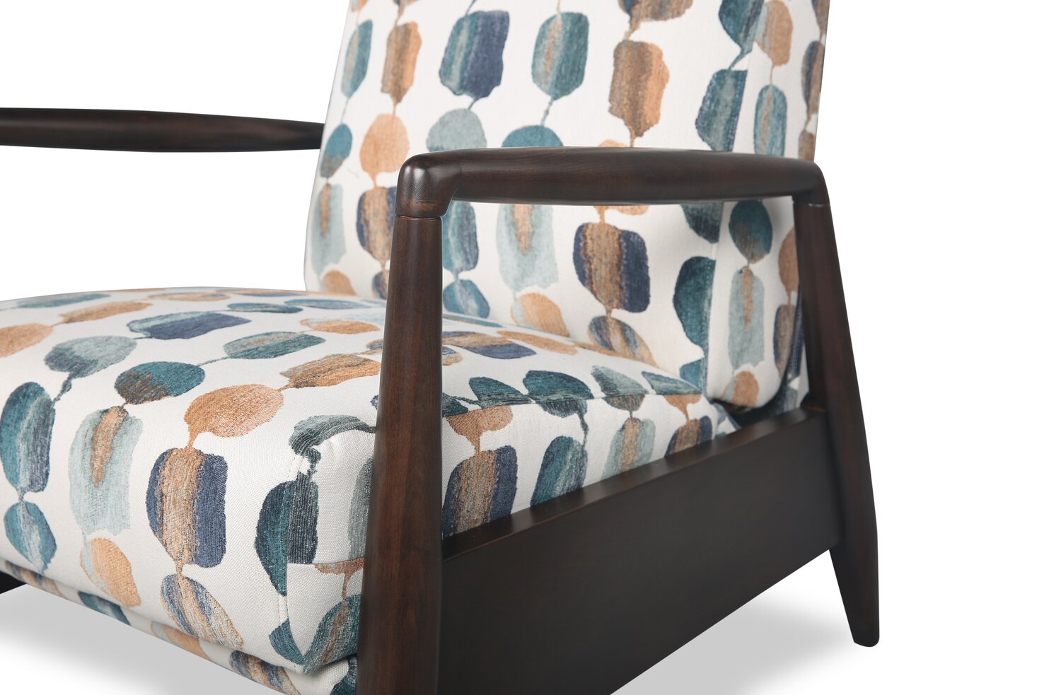 | Détails décoratifs | Les accoudoirs et les pattes en bois complètent les tons plus foncés du motif du tissu, ce qui fait ressortir les couleurs. |