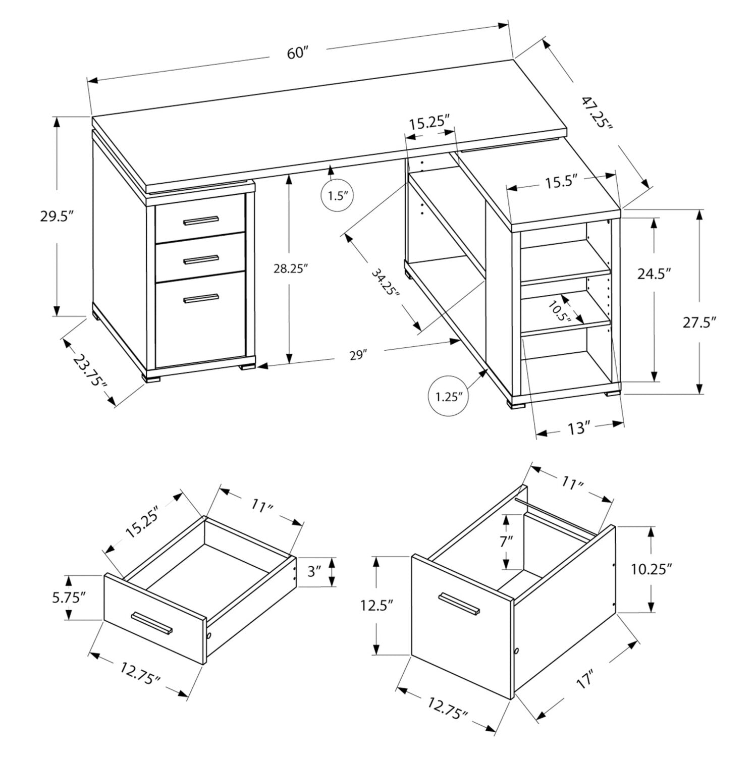 | Options de rangement | Le bureau possède trois tiroirs de rangement, y compris un pour les dossiers suspendus, et inclut un compartiment de rangement intégré doté de une tablette et trois compartiments. |