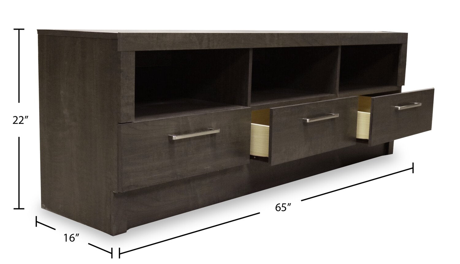 Largeur : 65 po (165,1 cm) Hauteur : 22 po (55,9 cm) Profondeur : 16 po (40,6 cm)