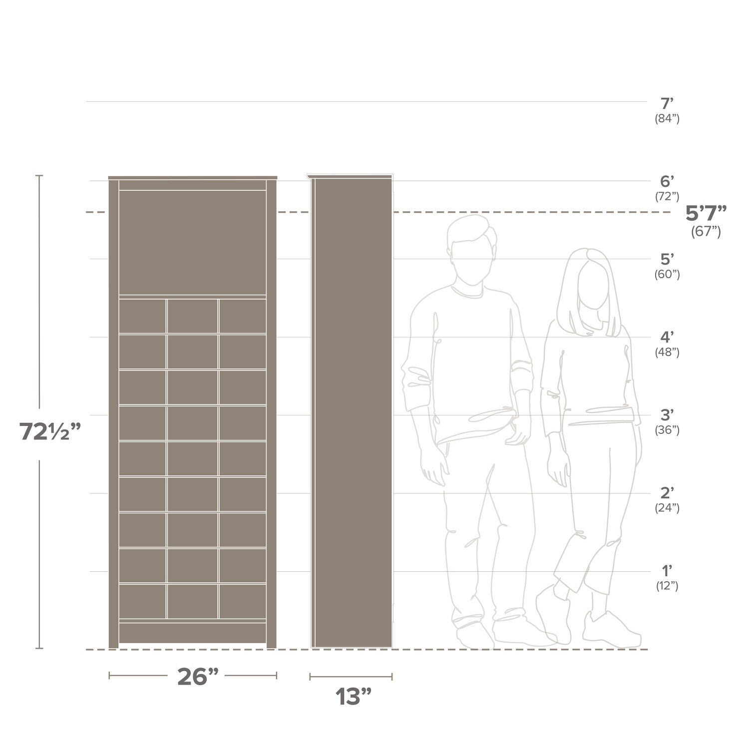 Largeur : 26 po (66,0 cm) Hauteur : 72,5 po (184,2 cm) Profondeur : 13 po (33,0 cm)