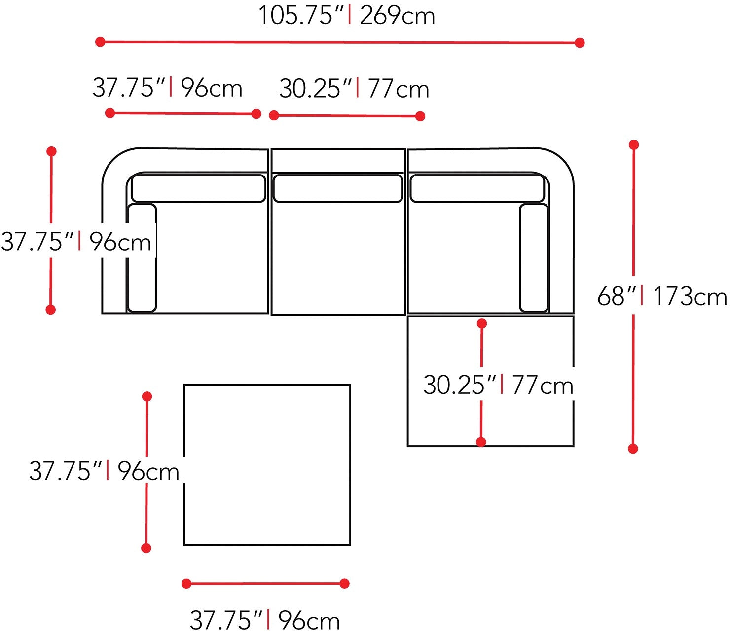 - Pouf (H x L x P) : 16,5 po x 30,3 po x 37,8 po (42 cm x 77 cm x 96 cm).