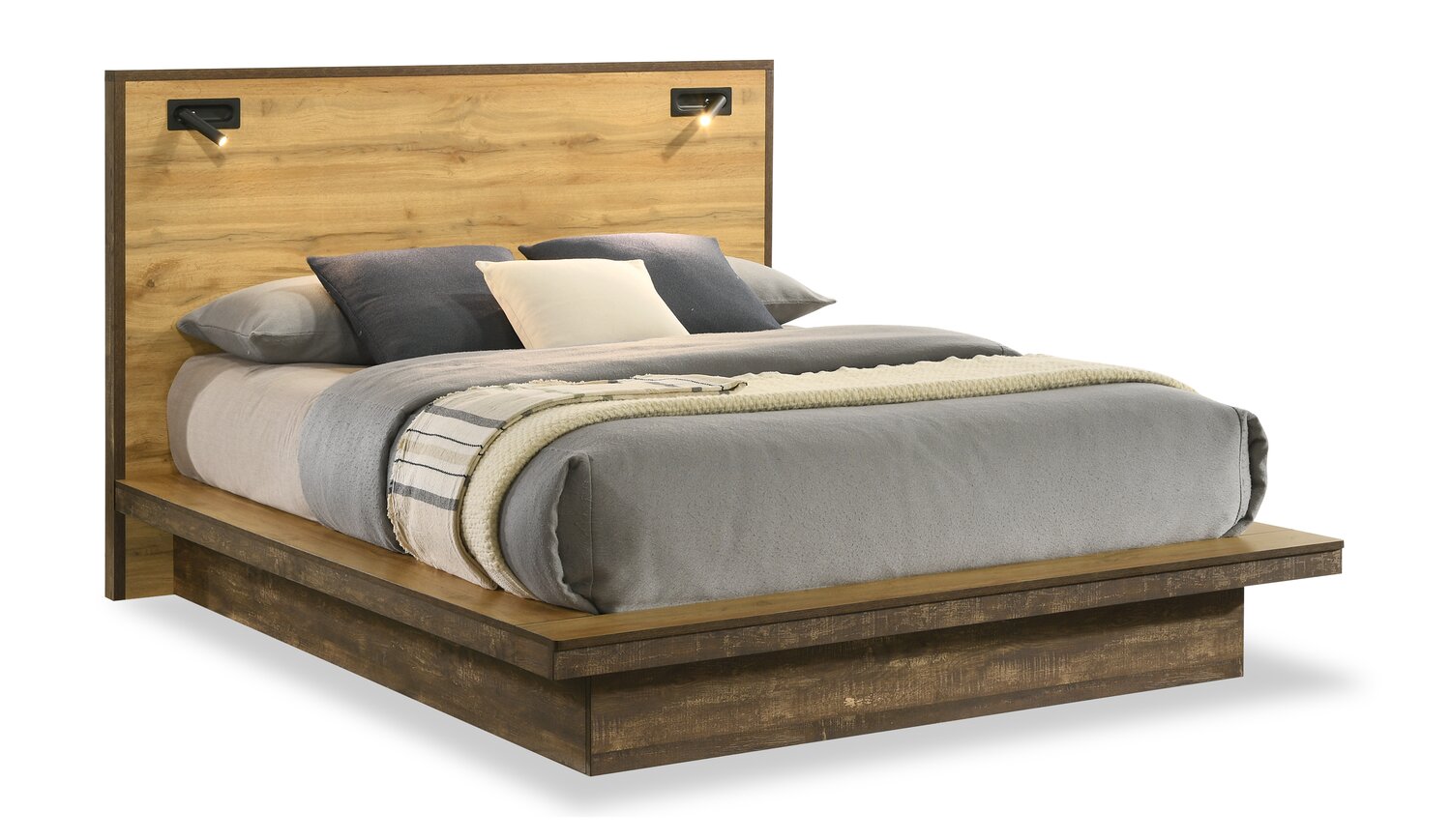 Lit plateforme Silas brun rustique avec tête de lit, cadre et éclairage à DEL - format lit double