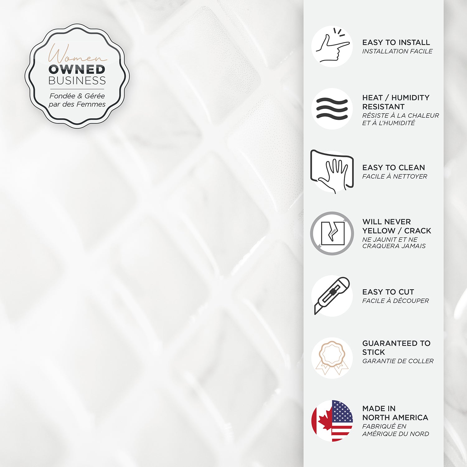 Les carreaux Smart Tiles sont robustes et résistants à la chaleur des poêles. Ils conviennent également comme dosseret dans les salles de bain (ne conviennent pas à l’intérieur de la douche). Simplifiez-vous la vie au moyen de ces carreaux innovateurs à coller au mur conçus pour les zones de dosseret des cuisines et des salles de bain. Fini les installations de carreaux salissantes, longues et stressantes avec du coulis ou de la colle. Projet à faire soi-même sans effort, instructions faciles à suivre incluses. Installation propre et sans poussière. Les carreaux Smart Tiles sont une œuvre d'art. Une fois que les carreaux Smart Tiles on entièrement adhéré à la surface, après 48 heures, il seront collés sans se décoller ni craquer pour aussi longtemps dont vous en aurez besoin.