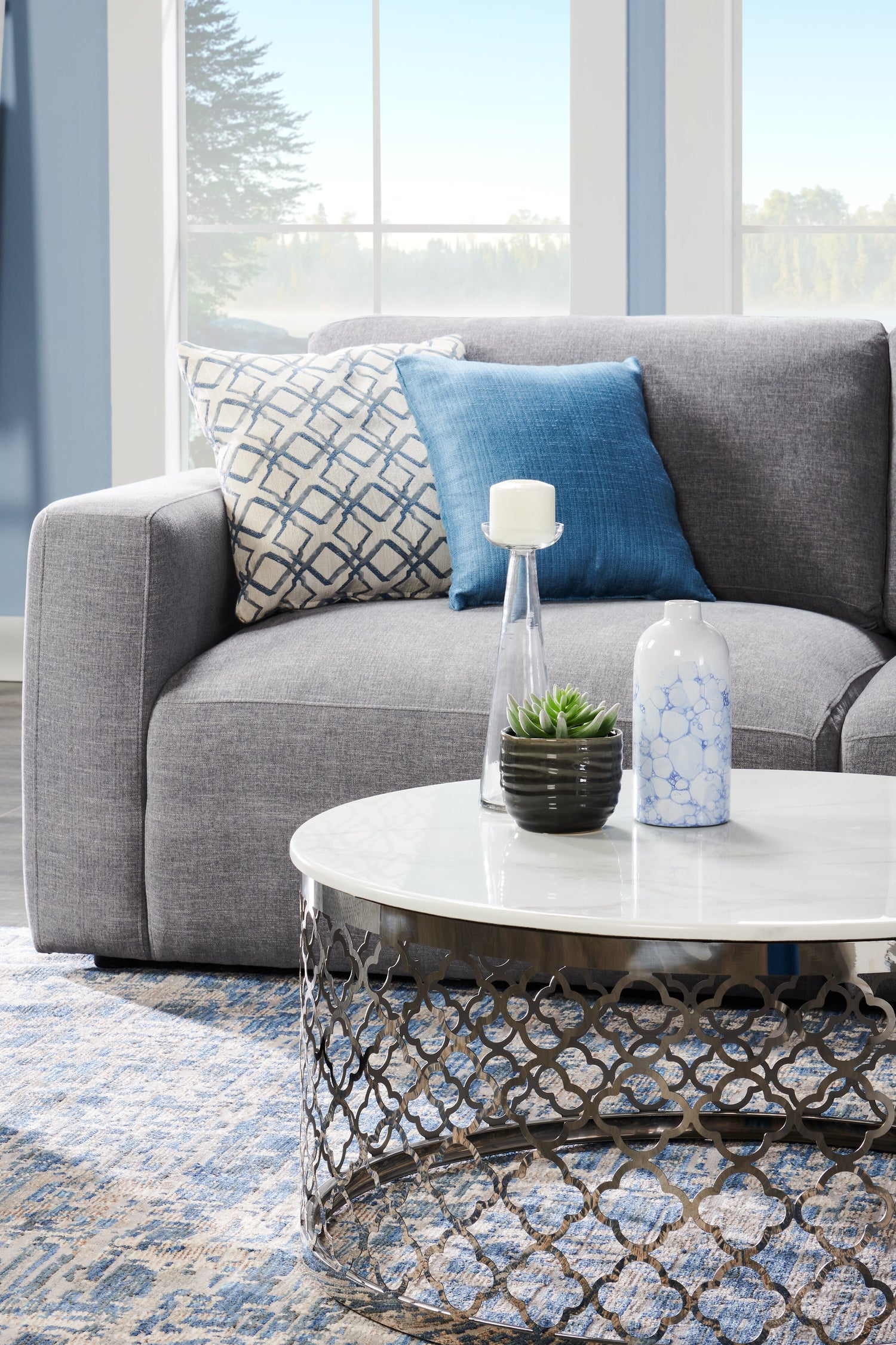 | Détails décoratifs | Diamants bordés de lignes bleues. |