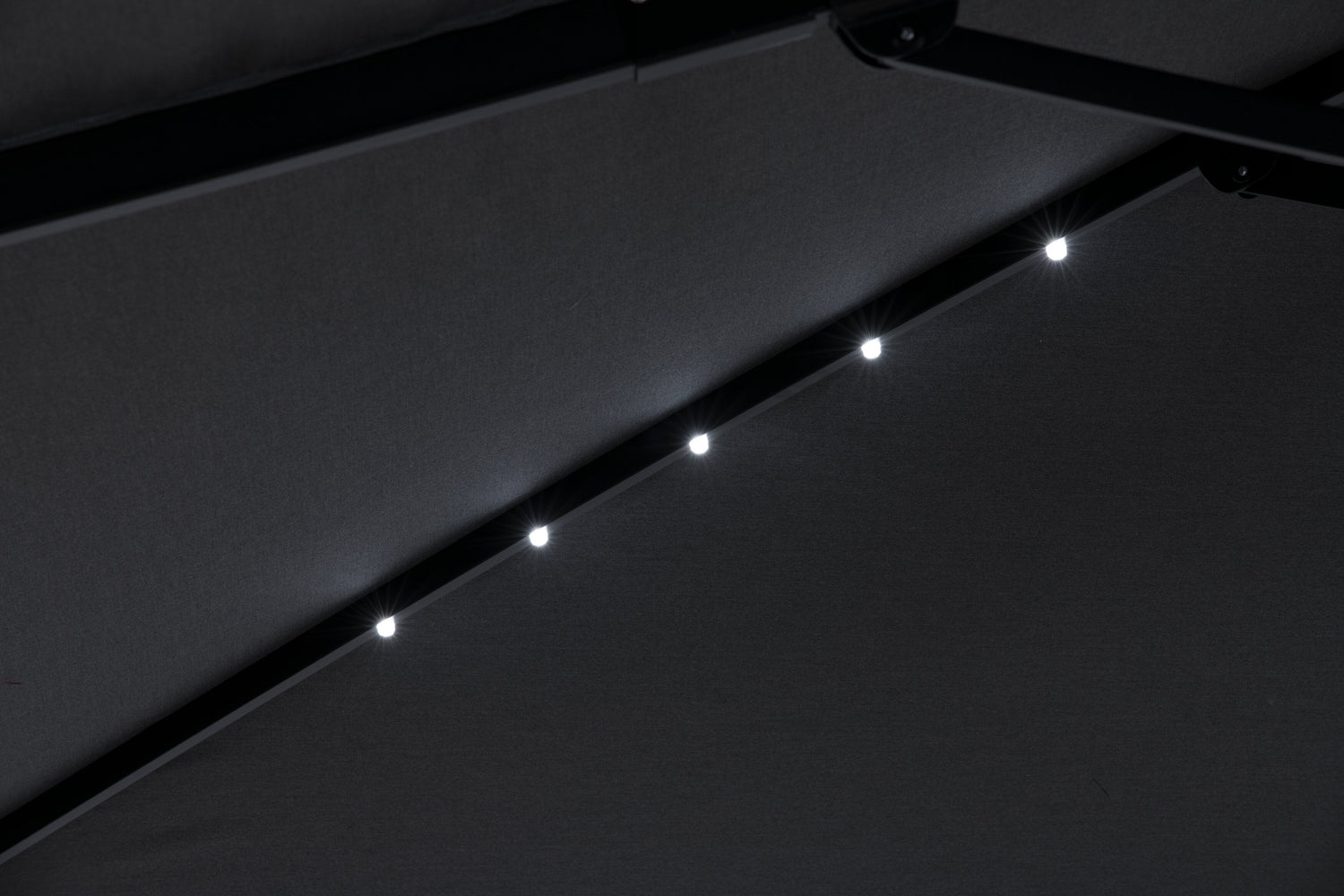 | Détails décoratifs | 5 lumières à DEL ornent chaque rayon du parasol. |