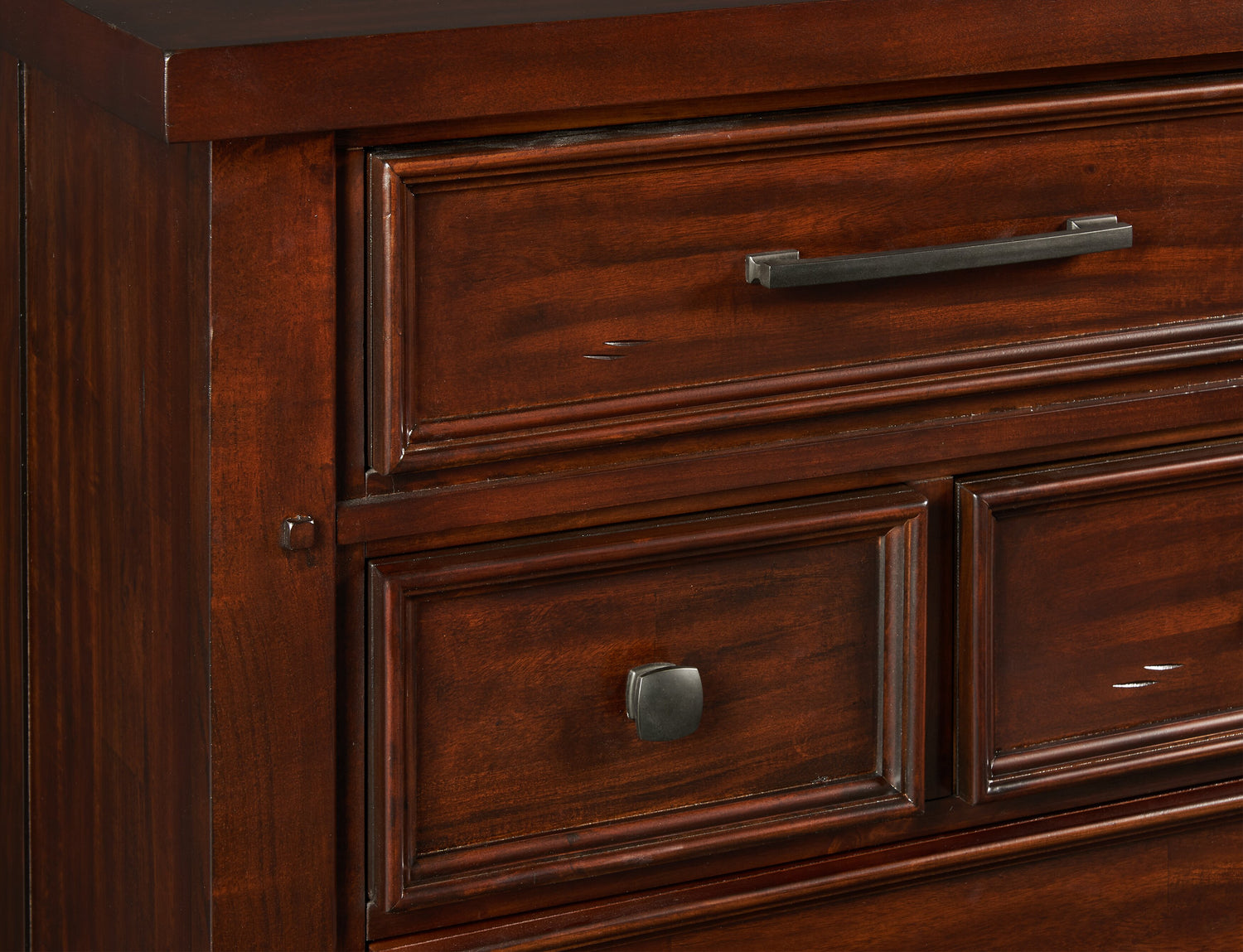 | Quincaillerie | Poignées et boutons de porte au fini étain foncé antique. |