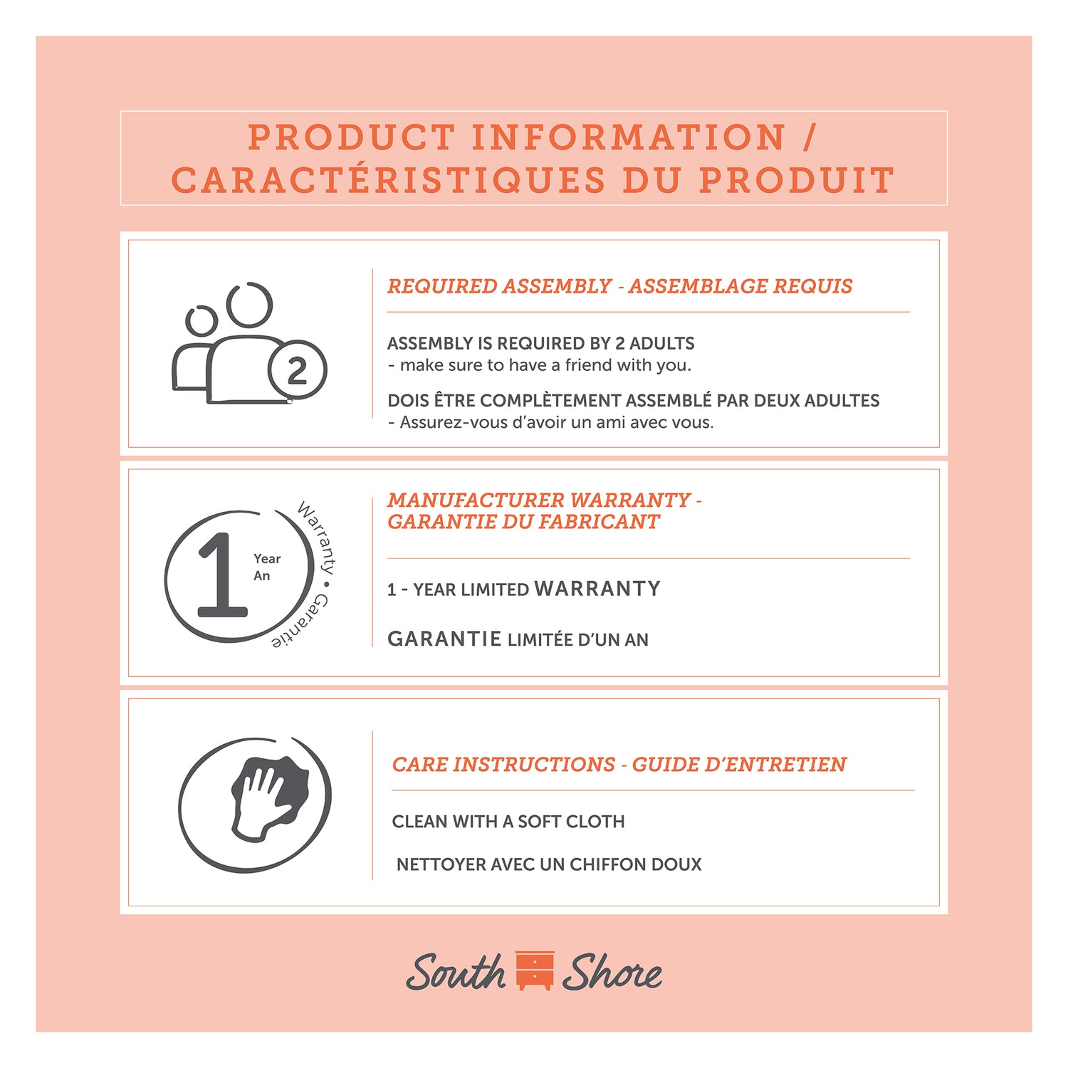 | Détails sécurité | Tous les articles South Shore répondent et excèdent les normes de sécurité nord-américaines et l’emballage est testé et certifié pour la réduction des risques de dommage pendant l’expédition. |