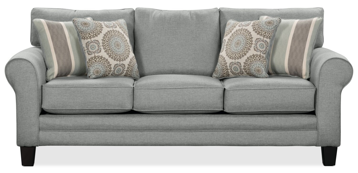 | Coussins décoratifs | Quatre, deux avec un motif de rayures bleues et grises, deux avec des motifs circulaires gris et bleus. |