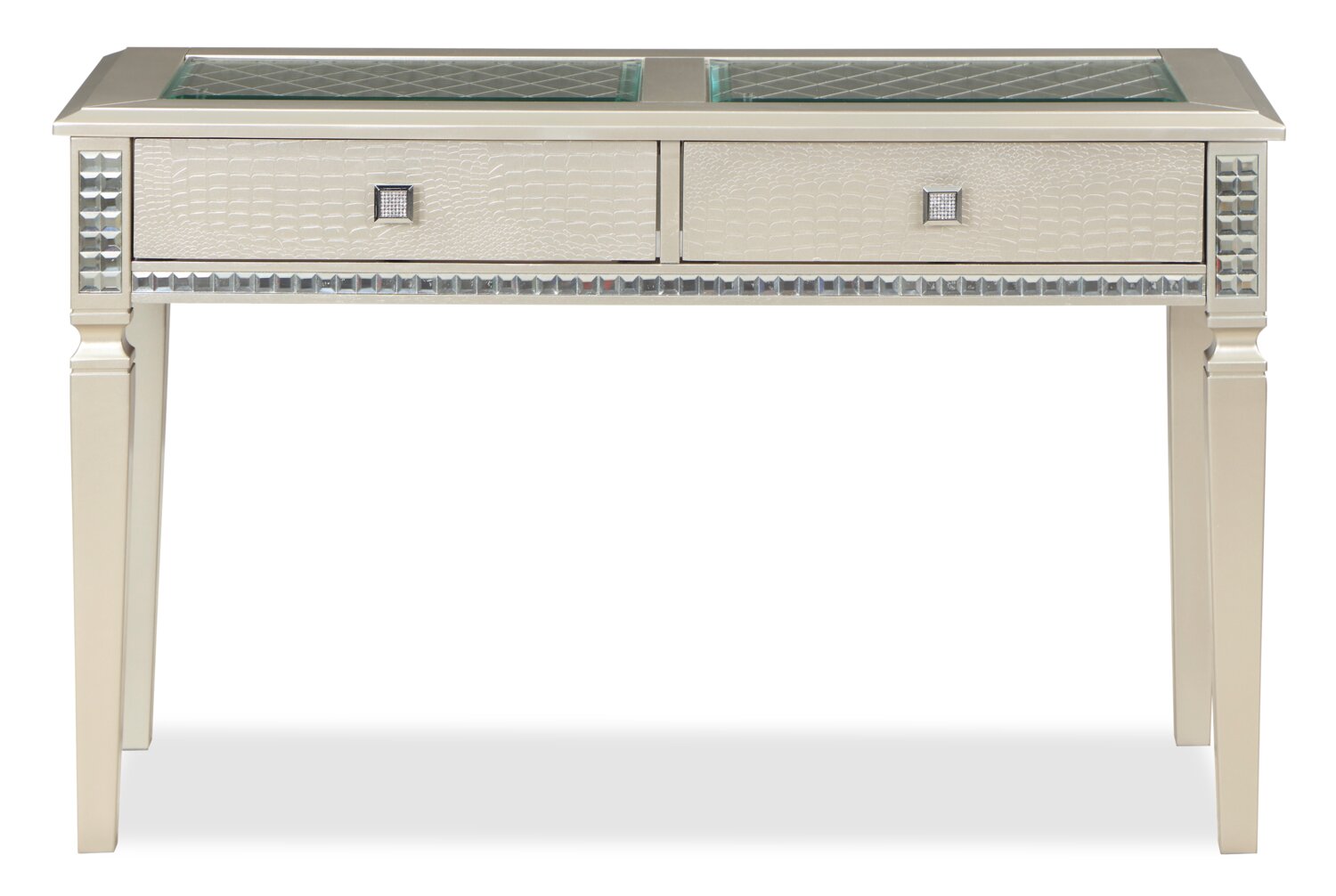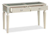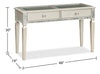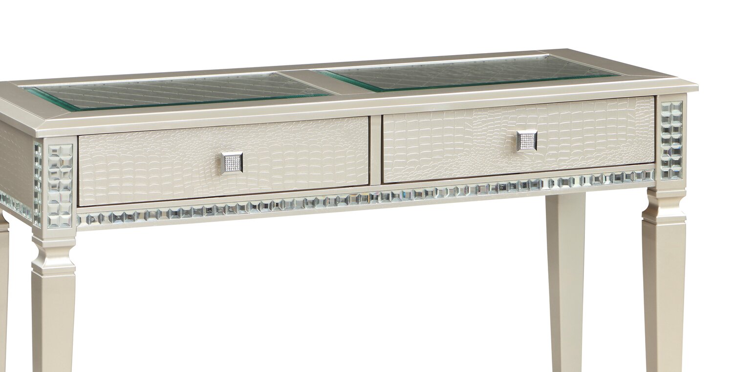 | Détails décoratifs | Dessus de table avec insertions en verre, bordure en miroir et quincaillerie en faux cristaux. |