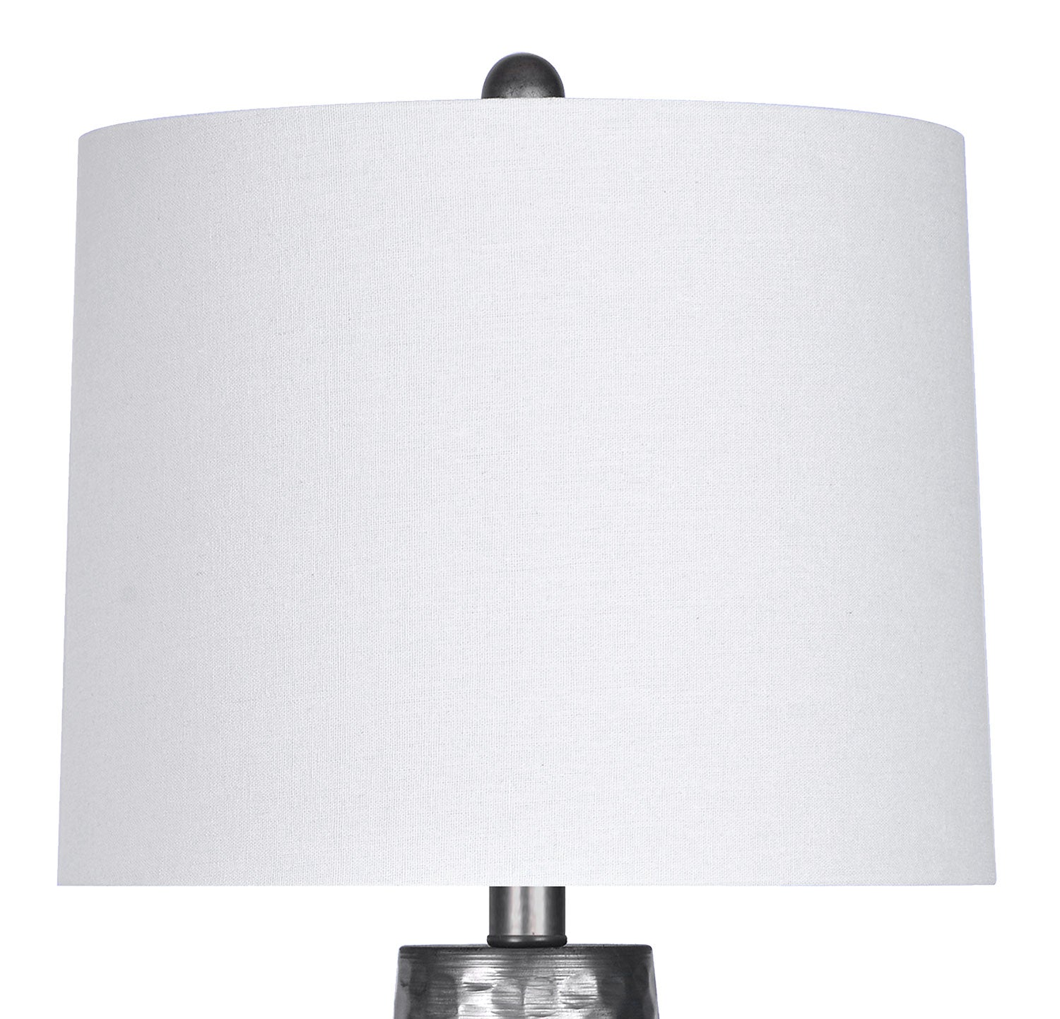 - Un tissu en lin beige couvre l'abat-jour cylindrique et s'harmonise au lustre de la base.