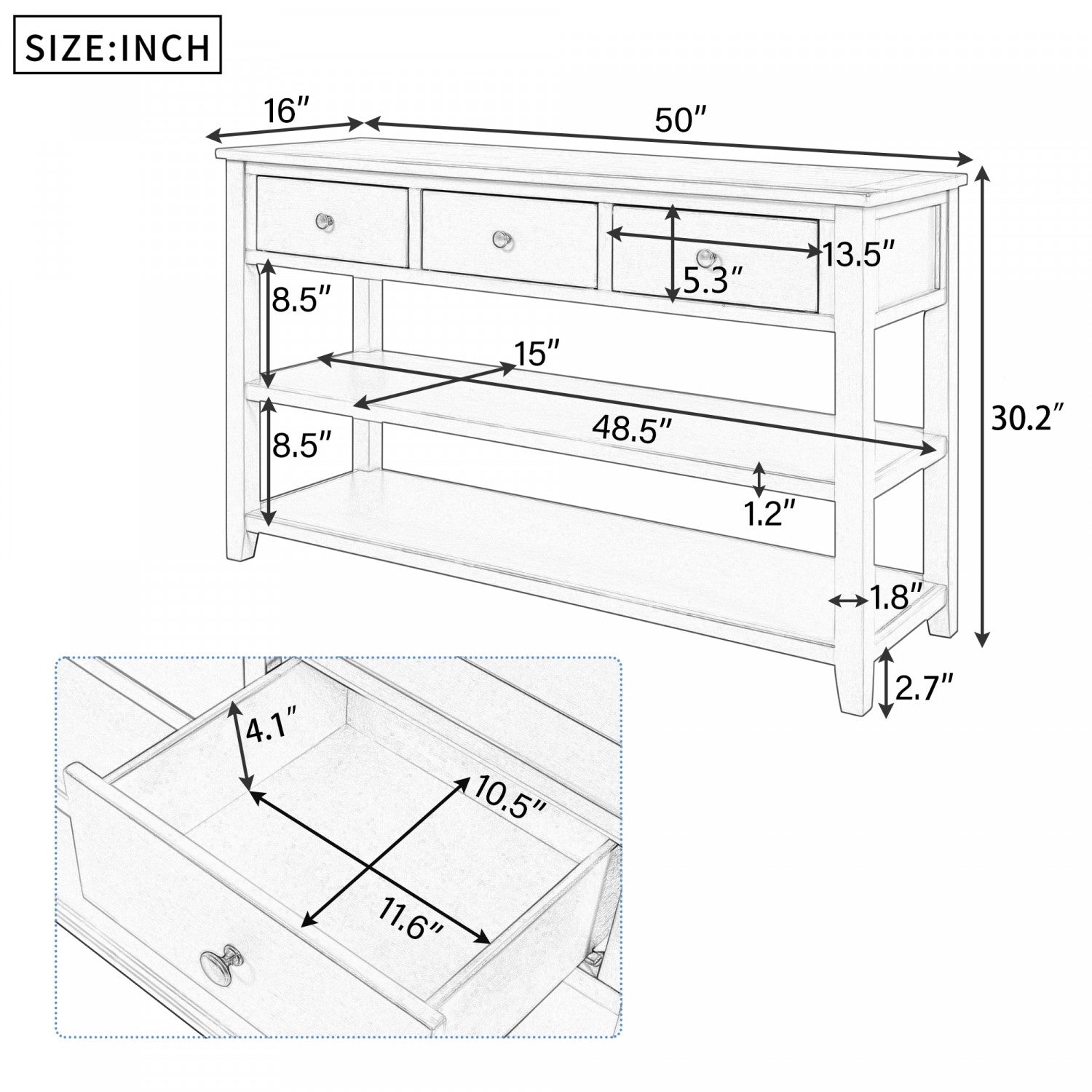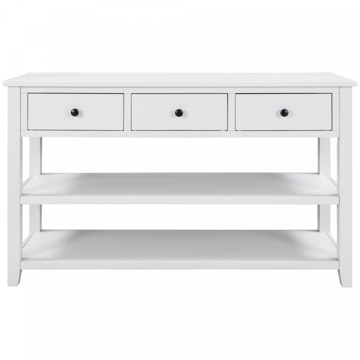 Console Wendy En Bois Massif Avec 3 Tiroirs Et 2 Etageres Ouvertes, Blanc Antique