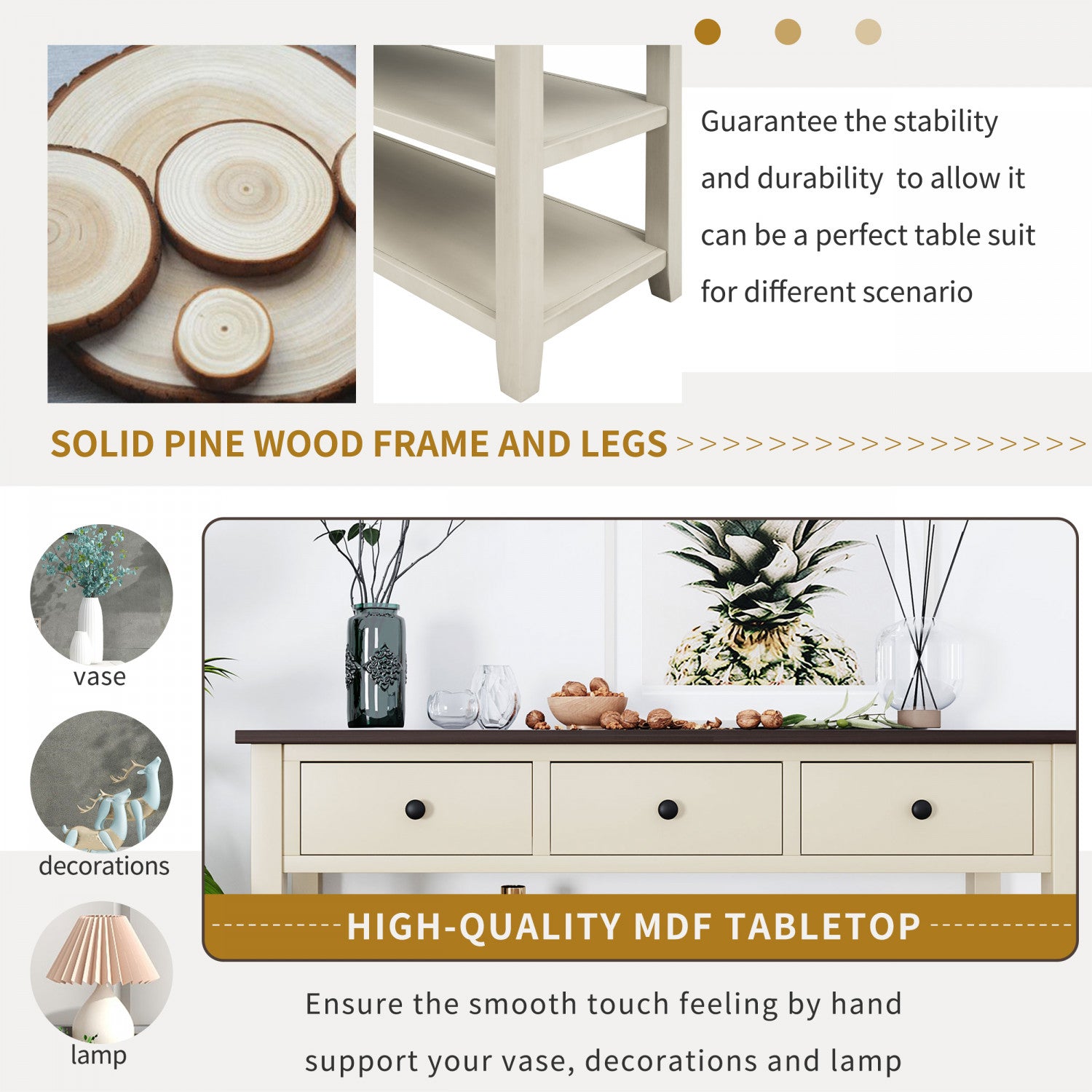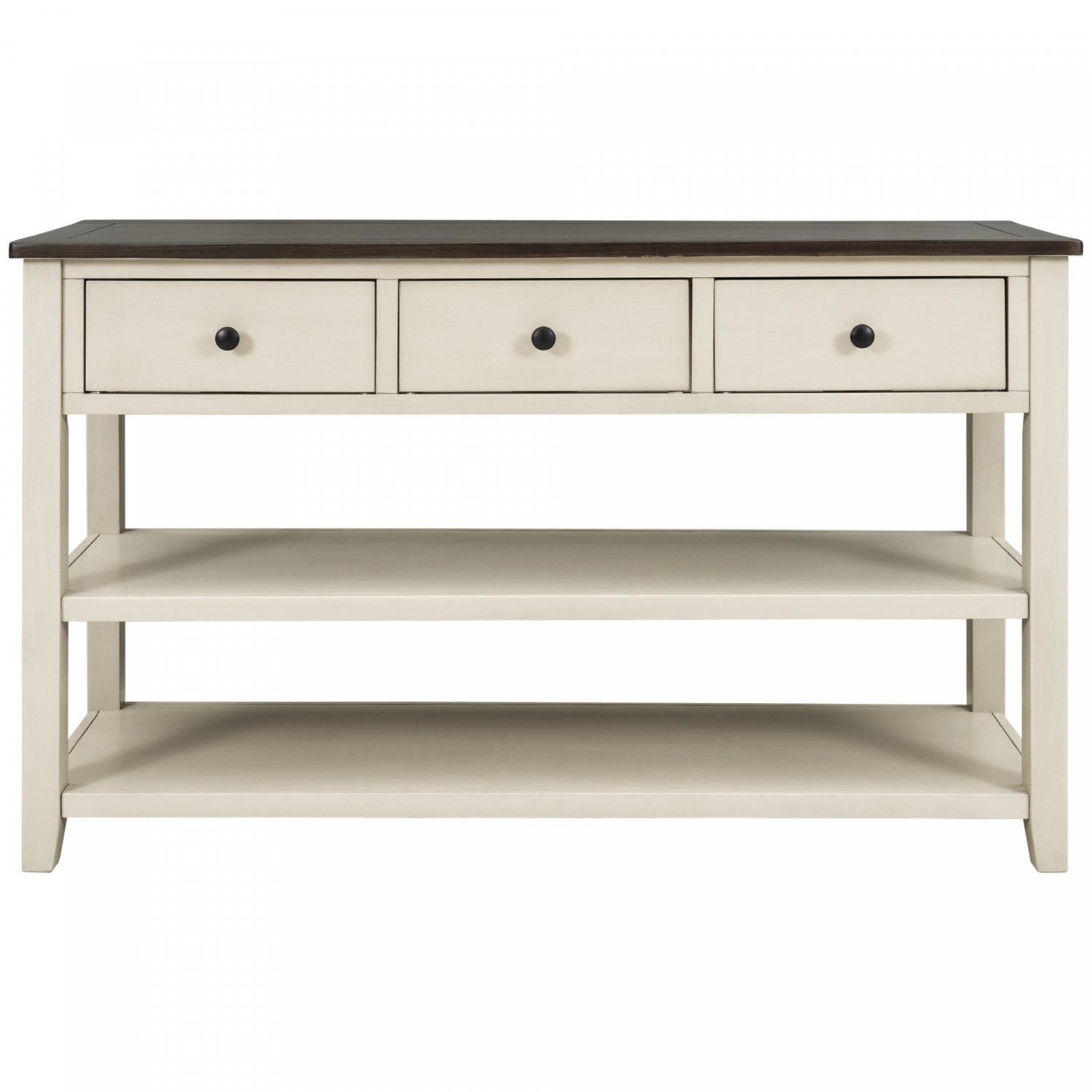 Console Wendy En Bois Massif Avec 3 Tiroirs Et 2 Etageres Ouvertes, Beige