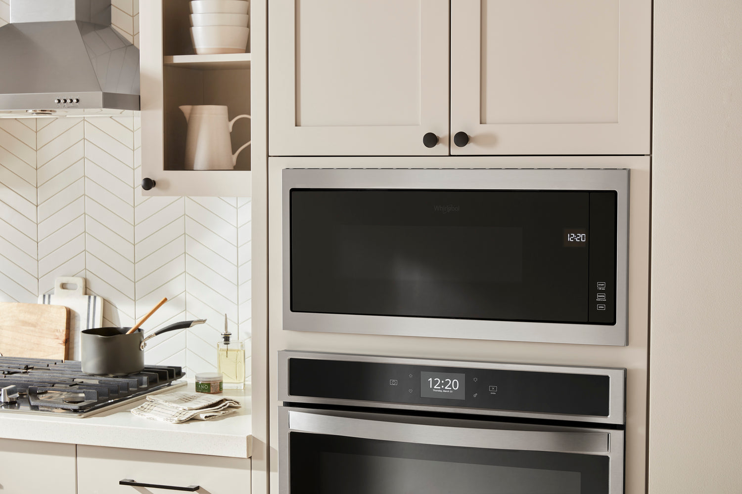 | Vendu séparément | Trousses d’encastrement pour une découpe optionnelle avec poignées encastrées pour un autre moyen d’ouvrir la porte du four à micro-ondes (vendues séparément par KitchenAid). |