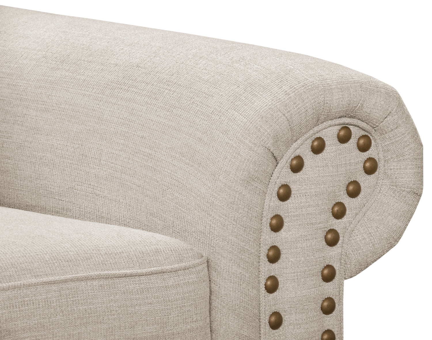 | Détails décoratifs | Des clous décoratifs ornent la base et les accoudoirs pour une apparence classique. |