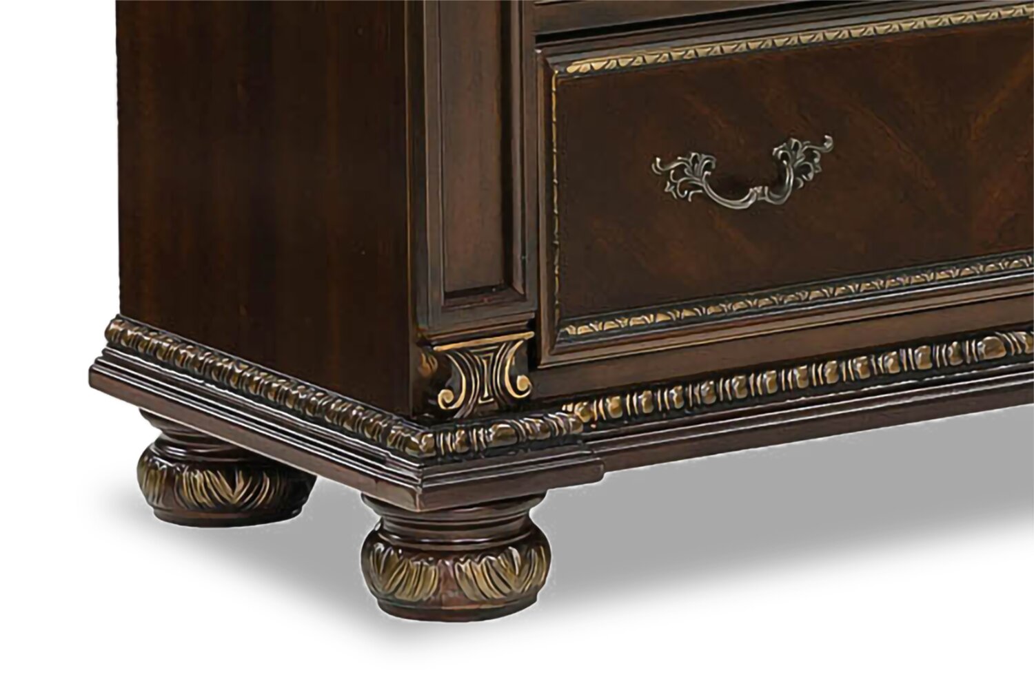 Somptueusement ornée, fiable et fonctionnelle, cette commode verticale Wynn ajoute une ambiance traditionnelle à votre chambre à coucher. Les placages de cerisier arborent un fini brun foncé pour rehausser la beauté naturelle du grain de bois. Des gravures à motifs floraux dorés encadrent les devants de tiroirs et les bordures externes. De plus, les poignées de tiroir courbées en laiton raffinées facilitent l’accès à vos articles essentiels de chambre à coucher ou à vos vêtements. Profitez du meilleur de la conception européenne avec cette commode verticale dans votre espace de sommeil.