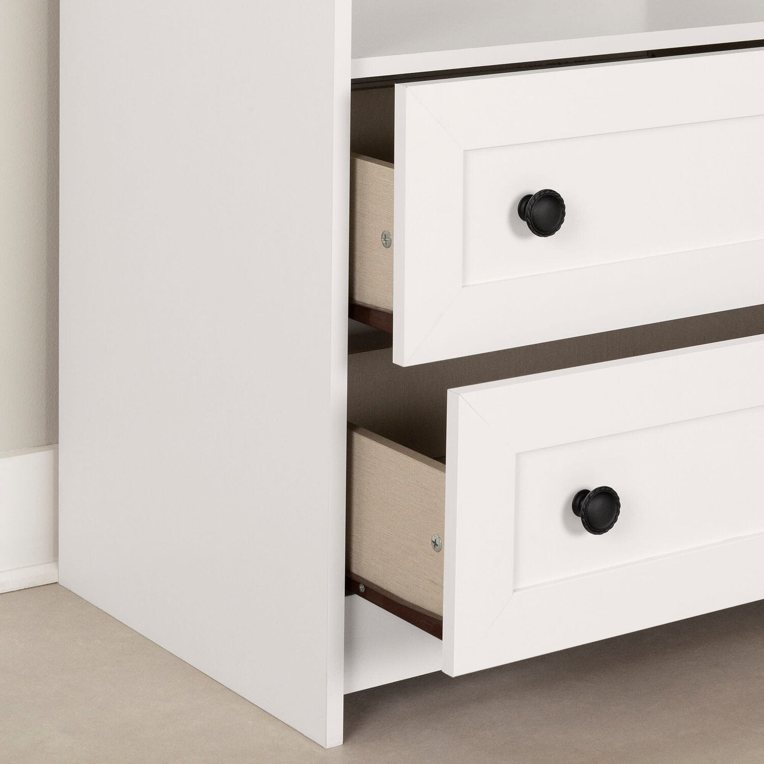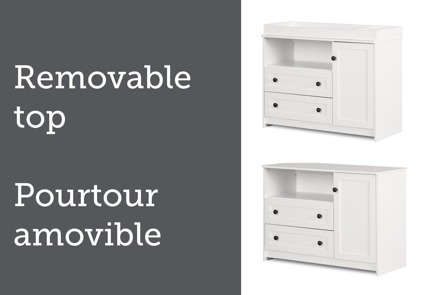 | Options de rangement | Deux tiroirs, une étagère ouverte et un placard. |